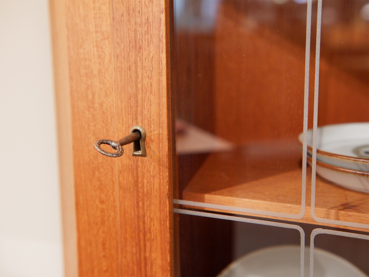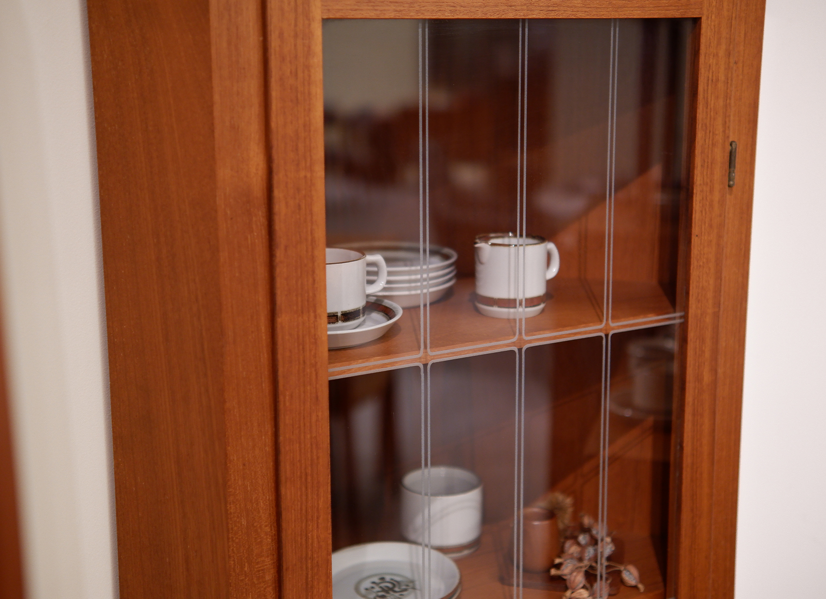 2026年1月9日 「Corner Cabinet」 Size / W:740 D:450/510 H:1425 Material / Teak 美しい杢目が印象的なチーク材を使用したガラスキャビネット。 壁に沿ってコーナーに美しく収まる設計で、空間の角を活かしながら自然に部屋になじみます。 前面のガラス扉には繊細な模様が施され、収納した器やオブジェを「見せる」ための上品なフレームとして機能します。 すっきりとした脚部は全体的に軽やかさと洗練された印象を与えてくれる、佇まいそのものが空間のアクセントとなる1台です。 本体:オイル仕上げ予定