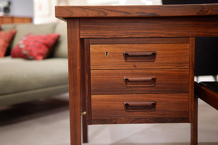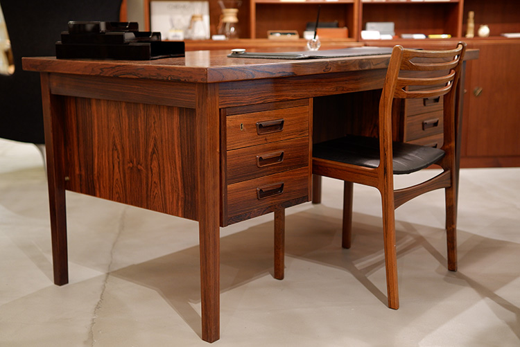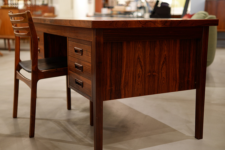 美しい杢目が特徴のローズウッドを使用したデスク。厚みのある天板とすっきりとした直線的な構成が、建築的な美しさを感じさせます。サイドにはそれぞれ3杯の引き出しを備え、実用性も十分。シンプルな取手のデザインも全体の印象を引き締めています。