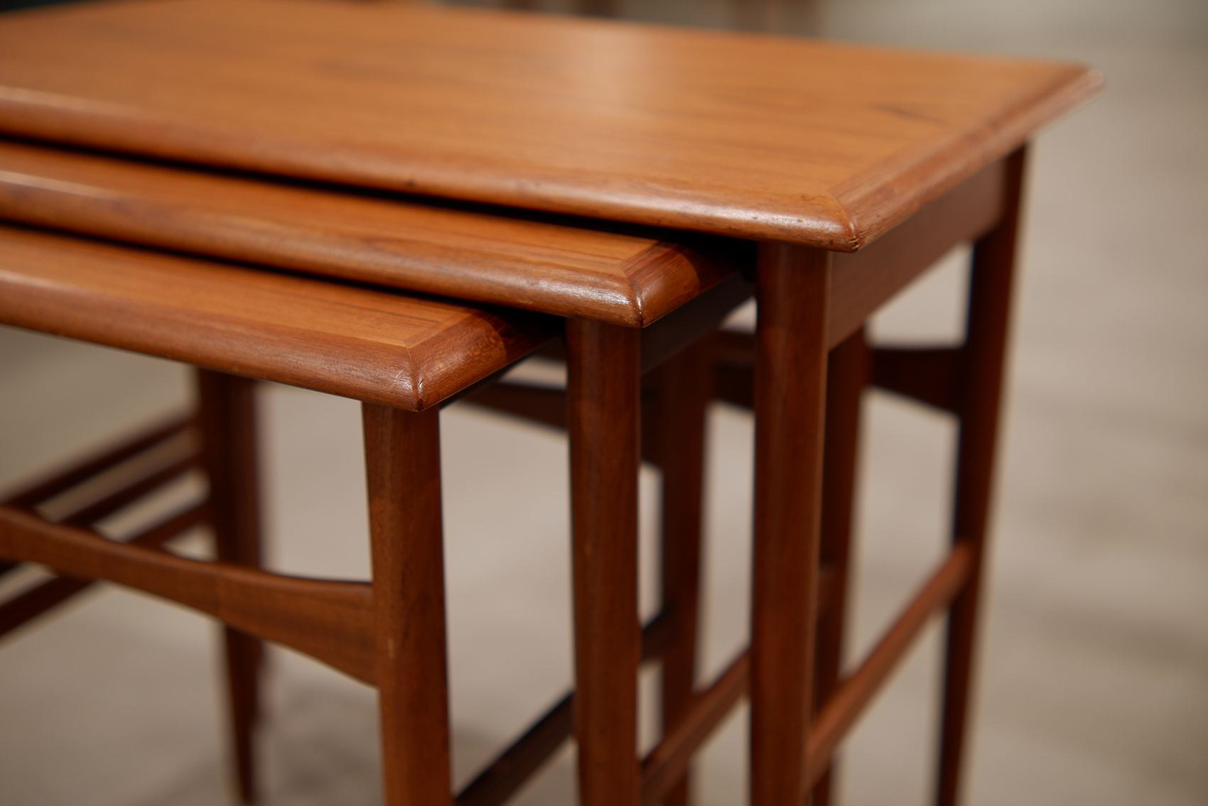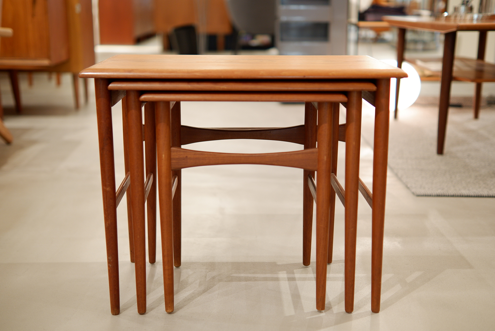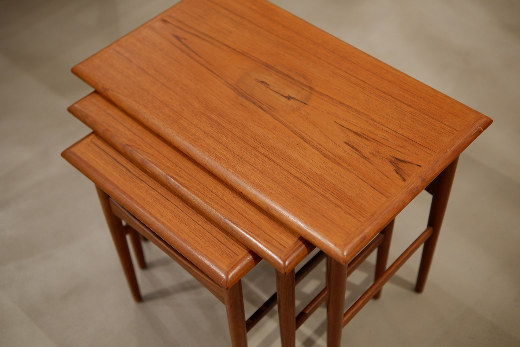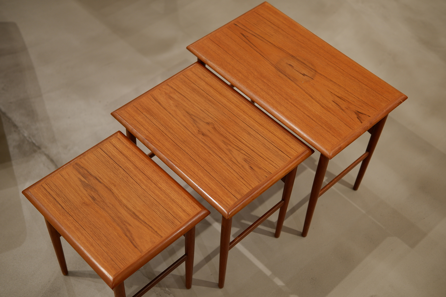 2026年3月8日 「Nset Table」 Size / W:600 D:400 H:380 Material / Teak 暖かみのある飴色のチーク材で作られたネストテーブル。滑らかに面取りされた天板とほっそりと伸びたテーパードレッグが美しいバランスでデザインされ、過度な主張がないのに印象的な佇まいです。大中小を重ねた状態で飾り棚のように使ったり、それぞれを別の場所に配置して楽しむこともできる汎用性の高いアイテム。北欧家具を取り入れるなら、ネストテーブルは最初の1つとしてとてもおすすめです。 本体/オイル仕上げ予定